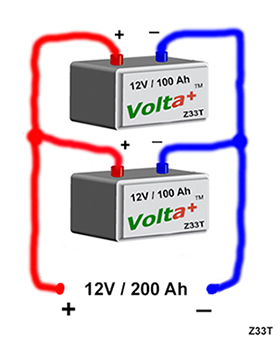 Пример 2: Ако два акумулатори, секој со напон од по 12 Волти и капацитет од 100 Ah, се поврзат во серија, ќе се добие вкупен напон од 24 волти, а струјниот капацитет ќе остане непроменет, односно ќе изнесува 100 Ah (100 амперчасови):