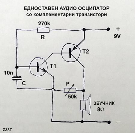 На почетокот од овој проект е прикажана електричната шема на едноставен нискофреквенциски осцилатор (мултивибратор) со комплементарни транзистори. Комплементарни транзистори се нарекуваат два транзистори со слични карактеристики, од кои еден е NPN, а другиот е PNP.