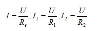 Вкупната електрична струја I е еднаква на збирот од струјата I1(која тече низ отпорникот R1) и струјата I2 (која тече низ отпорникот R2):