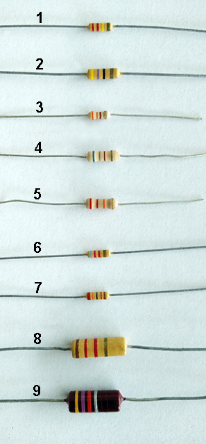 9. Отпорникот со реден број 9 на горнава слика ги има следниве 4 прстени во боја (од лево на десно): жолт, виолетов, црвен, сребрен.
