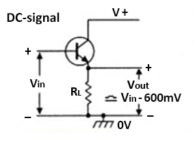 Влезниот сигнал е приклучен помеѓу базата и колекторот, а излезниот сигнал се добива помеѓу емитерот и базата на транзисторот. Ваков засилувач е познат како „емитерско следило“ или „напонско следило“. На долната слика е прикажан принцип на засилувач со NPN транзистор во спој со заеднички колектор (емитерско следило, или напонско следило):
