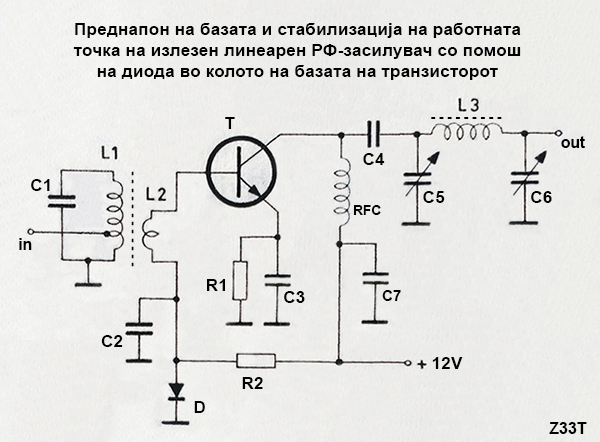 На следнава слика е прикажано добивање на автоматски работен преднапон на базата на транзисторот и стабилизација на работната точка на транзистор во излезен линеарен РФ-засилувач: