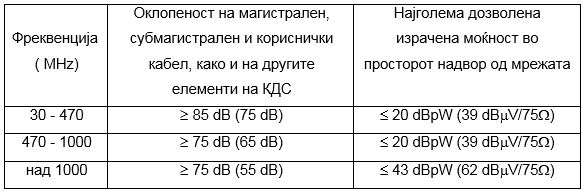 Најголема дозволена моќност на зрачење од елементите на дистрибутивната мрежа во надворешната околина изнесува 0.0000000001 W. Ова е еквивалентен износ на ниво од 39 dBµV на 75 оми. Овој податок ни покажува, за колку работното ниво на системот може да биде повисоко од 39 dBµV, со тоа што попречувачкото зрачење нема да биде поголемо од 39 dBµV.
