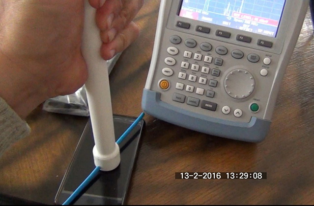 Антената за мерење ја допрев до мобилниот телефон и ја мерев јачината на електромагнетното зрачење (на тој начин симулирав реална ситуација кога телефонот е допрен до главата на корисникот):