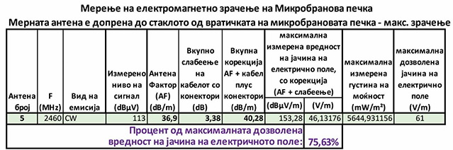 Тоа може да се види од следниве две табели на кои е прикажано мерењето на електромагнетното зрачење на растојание од 1,5 cm и на 0,5 m од вратичката на микробрановата печка: