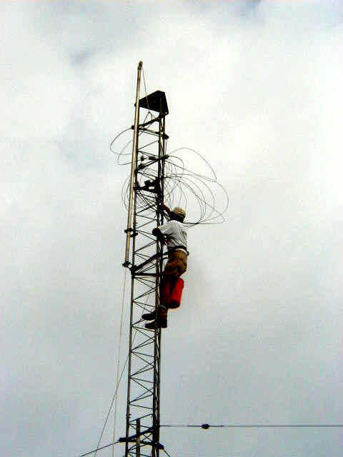 When I returned to Little Cayman in October of 2000, I arrived just in time to make some station improvements for CQWW-SSB. Mark Perrin, N7MQ, and Ron Vincent, WJ7R, came down from Eugene, OR to operate the contest. Mark would be SOSB/80 as ZF2MC, and Ron would be SOSB/10 as ZF2RV. Before the contest, we spent a couple of days putting up a full-size vertical about 70' back from the water's edge. Since this had elevated radials, the full height of that thing was about 75'. Yes, "was"! It was a thing of beauty and it played exceptionally well for mark (at least when transmitting!), but it didn't survive even the first good blow we had after Mark went home. We had the antenna guyed at three levels, but the tubing simply was not strong enough for the compressive forces on it once the winds picked up. I still have lots of that tubing left, but it's obvious to me now not to try to go so high with it.