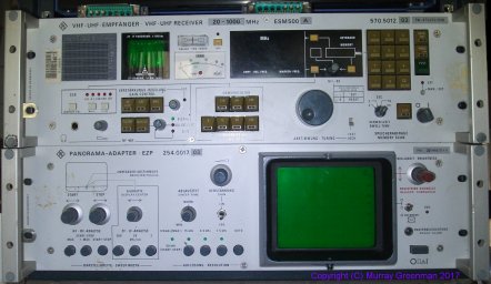 This beautiful rack-mount surveillance receiver covers 20 - 1000 MHz (the A version), and is accompanied by the EZP Panoramic Adaptor. There is also a small panoramic display built into the receiver. The ESM-500A and EZP can be remote controlled via IEE-488 or RS232, and set to a resolution of 10 Hz. There is an oven-controlled reference providing 1 x 10-8 accuracy. There are two synthesisers, providing for double conversion. The first IF is 310 MHz or 810 MHz, and the second IF is 10.7 MHz. The receiver weighs 18 kg, and is rack mounted.Unfortunately my Rohde & Schwarz ESM-500A VHF Receiver is not operational, although the EZP Panoramic Adaptor works. I have the manuals.