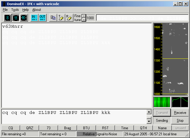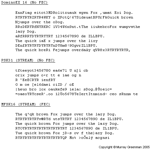 With no error correction, copy at -10dB S/N in 3kHz bandwidth (a signal you can barely hear) is nearly as good with DominoEX16 as MFSK16, (which is error corrected, but half the typing speed), and better than PSK31 and MT63. With FEC on, at this signal level you will copy 100% for hours at a time. Simulations have shown that it is also significantly more robust than these modes under poor propagation conditions. Unlike MFSK16 and many other modes, it is easy to tune. The mode has special properties, especially suited to the lower bands.