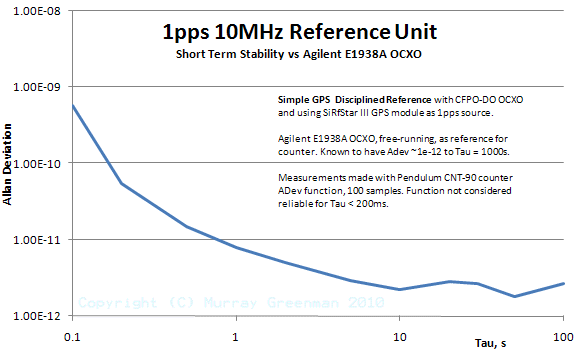 Short Term Stability Performance of prototype unit using CFPO-DO3 OCXOThe serial data can be used for time and performance logging, or could be adapted as an SNTP source. The real time clock is independent of GPS time, but has the same accuracy as the reference. The clock can be synchronized to within a few ms of the 1pps reference. The phase and frequency information can be used for calibration or long-term tracking of the reference oscillator performance. A special companion PC monitoring program 1PPS10A has been designed for this unit, and is supplied with the firmware.