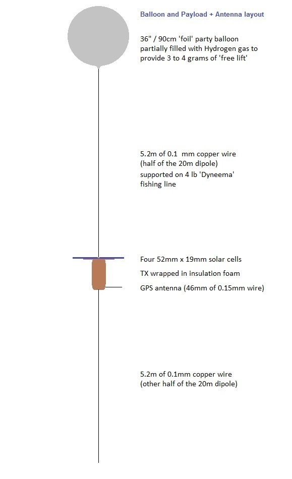 The tracker transmitter uses modified QRP-Labs U3S firmware running on an ATmega328 with a 16 MHz clock and a nominal 3.3V supply (so working out of spec). The board is a smaller custom made PCB (thanks Mikael). This board uses a very cheap TCXO from China and a uBlox Max-7c GPS, and is flown 'naked' (no insulation). Power output is 10mW. The power supply is four 39 x 19mm solar cells powering the electonics via a 3V3 boost regulator. The antenna is a 20m dipole made from 5.26m of 0.1mm copper wire supported on 4 pound breaking strain "Dyneema" fishing line going up to the balloon, and 5.26m of 0.1mm wire dangling below the payload. The TX and solar cells weighs 5.4 grams and the whole payload with antenna weighs about 6.4 grams. This flight uses one 90cm 'party' balloon inflated to give about 5 grams of 'free lift'. The expected float altitude is around 10,000m ASL.