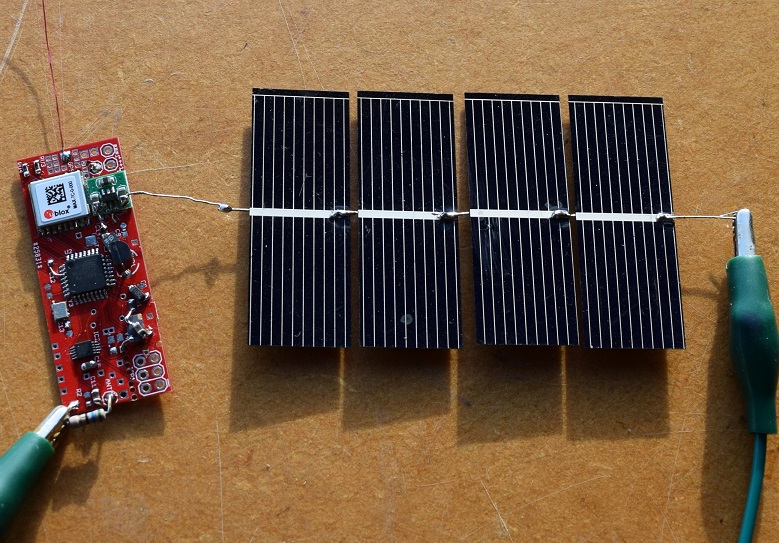 Prototype HF telemetry balloon transmitter version 1 - approximately 15 grams plus antenna and solar cells. Not flown, too heavy.