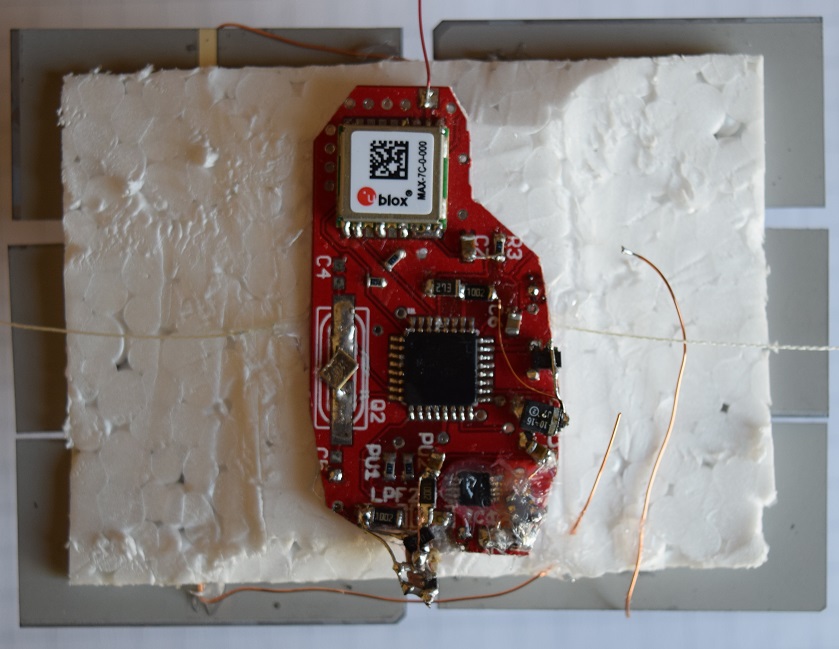 Prototype version 2 (without the PICAXE controller, battery and boost regulator) - approximately 8.5 grams plus antenna and solar cells. Destoyed at launch due to a gust of wind.