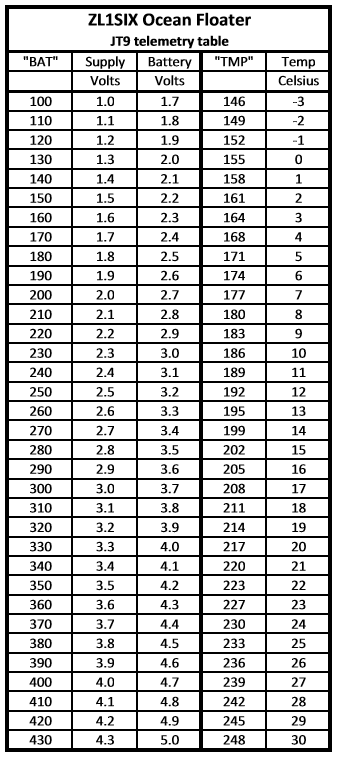 The JT9 telemetry figure BATxxx divided by 100 gives the 'supply' voltage. The battery voltage is 0.7V higher due to the protection diodes in the battery pack. The second telemetry figure TMPxxx minus 155 then divided by 3.12 gives the internal temperature e.g. (203 - 155)/3.12 = 15.4 degrees Celsius. A convenient 'quick lookup table' is provided below: