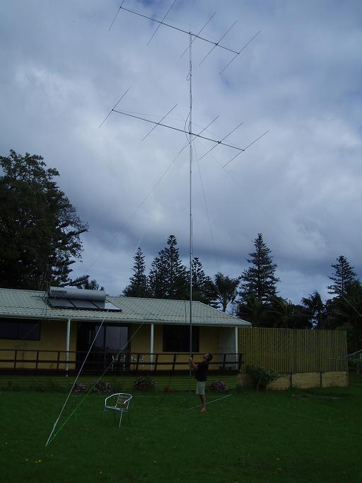 Picture taken looking due West from the Captain Cook Memorial lookout. Update as at 00:00 UTC on 30 March 2012 6m news via ionospheric propagation: I'm making a short CQ on 50.110.6 once every 3 minutes or so with the auto-keyer when 6m is likely to be open. When there is an opening with good propagation I have been QSYing to 50.104 or 50.105 for CW and SSB QSOs. A nice opening on 28/29 Mar to VE7 and the NW USA with over 70 stations worked. Nothing further south except one or two W6 stations. TI7/N5BEK also heard. The KH6 beacons were S9 at around 07:30 utc last night, and Fred KH7Y was very loud. A few JAs and one DU worked from the NW direction yesterday. The 49.750 vids were weak. A few stations from NA have looked for my JT65A CQs on 50.190 at moon rise and so we have managed "direct" digital QSOs with N6KK and K7CW when 6m apprears "closed". Obviously the band is marginally open and the sensitivity of JT65A makes the difference. My moon rise direction is still close towards the NA azimuth for the next few days. See the table towards the bottom of this page for my moon rise times. If you decode or hear my digital signal, please call. I am not propagation mode or signal mode specific and am more than happy to work anyone, anywhere, anytime on any mode via any means! :-) 6m news via EME propagation: The ground gain lobe and nulls are now very well defined and it is pointless operating with the moon any higher than 10 degrees here where the first null starts. Due to the antenna system being stacked 5/5 Yagis there are no higher lobes. To this end, I will finish earlier on moon rise windows and start later on moon set windows (therefore the window times given below will be 10 or so minutes shorter in each case). EME conditions the last 2 windows have been VERY difficult ... rapid QSB, etc ... but the best EME conditions by far are still to come early next week! Good luck to all. New stations worked via EME: G4IGO -25 New EME callers decoded: LZ2WO OK7XX W7MEM (both via moon echo and via ionosphere simultaineously) G5WQ and a few other traces ... Pictures of the antenna system during assembly and when first raised