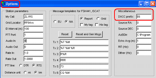 We went to Niue from 15-21 Sept 2012 and operated a little on 6m only. Spent some time visiting people and places I knew when I worked there from 1982-1984. We may make another trip to Niue for 2m EME ... still to be decided. (The old 2m EME related information is still below for reference only) E6RS in grid AH51BA will always TX First on or around 144.140 using WSJT's JT65B mode. Don't be offended if I skip "73" and move on to the next station to save time. have preference during MR and MS for the first week due to the short common window between Niue and Europe. I will be listening for CW callers and may answer using WSJT's CW mode (144.140 + 600Hz USB audio tone). CW will be with exact 1 minute sequences syncronised to UTC ... E6RS transmitting on the even minutes only. (Note that this is a different Grid to the one I operated in via 2m EME as ZK2RS during 1983/84). Equipment - IC706mk2g, HB GaAsFET preamp, HB 8877 PA, HB 4 x 7 element 2m Yagi array with full elevation. To set the new E6 DXCC prefix in WSJT ... go to the Setup menu - Options - and add E6 as shown here: