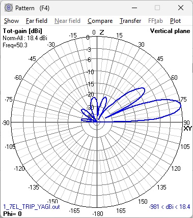 Special thanks to the following donors supporting this DXpedition: N7NR, AA8CH, G4BWP, G8VR, DL8YHR, PY2XB, JG1TSG, SP3RNZ, G8BCG, N0TB, OH4SS, OH7KM OG2M, GM3POI, SP4MPB, SP7VC, PA5Y, DK8NE, N6JV, PA3CMC, K4PI, OH6MW, MD0CCE, K0KT W5ZN, DK2PH, K2ZD, KJ9I, F5UKW, K5XI, K1TO. N5DG, K1UU, SM7FJE, N4SIX/NC4YL/K4AKX, N1DG F5LNU, ZS4TX, F6BKI, S57RR, OH2MA, W0GJ, N7IP, W7JW, N9PGG, OH2BU, K5XI, XE2K/AD6D K4PI, G5WQ, OZ4VV, OH1MA, OH6MW, N6KK, ON4IQ/ON4GG, HB9Q, VE1PZ, GM0GAV I hope I have everyone, there was a lot going on with this year's two earlier DXpeditions and other activities ... my apology and please email to remind me if I've unintentionally slipped up here. Here are the theoretical ground gain lobes of the 7 element Yagi over 'good' ground towards moon rise ... and over 'sea water' towards moon set