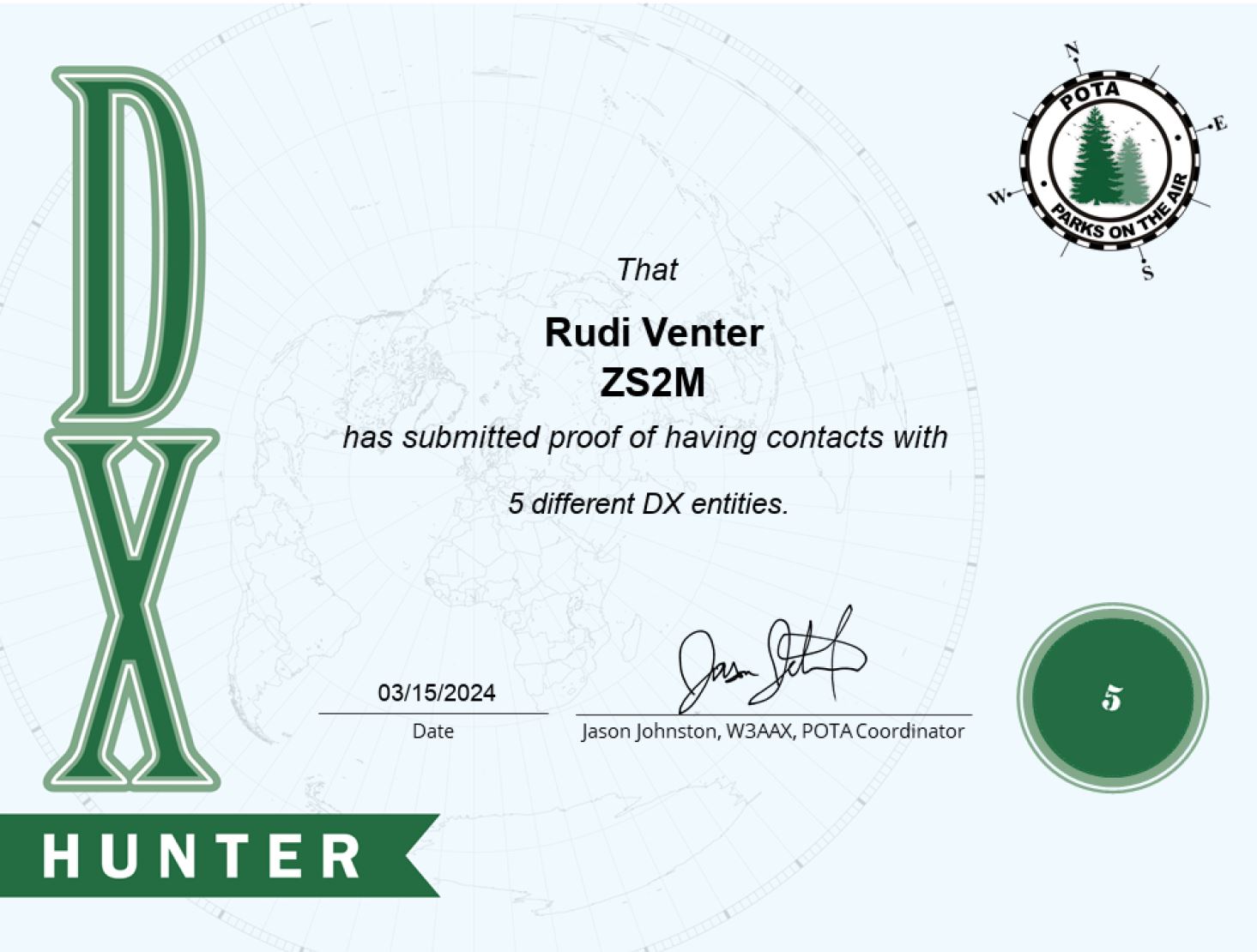 I have not been actively hunting POTA parks, till now anyway, but I was pleasantly surprised to see on the POTA web page that I have already been awarded a certificate for working parks in 5 different DXCC entities!