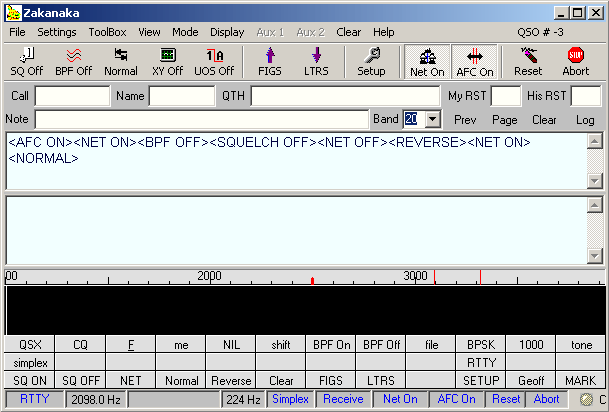 Zakanaka is a standalone program that can also be used as an integrated part of the Logger program, in this mode the QSO’s are logged directly into the main station log. Zakanaka has many features that are similar to Digipan, it can also monitor 2 signals at the same time and the display and general feel of the program is similar. Zakanaka supports RTTY as well and it uses the powerful MMTTY engine to do this. This combination will give most dedicated RTTY terminals and modems a run for their money. Tuning for RTTY is similar to PSK31, you simply click on the signal on the waterfall display and it will be decoded in a window, This program offers features that makes decoding weak and fluttery signals easy. The MMTTY engine is used by several programs to decode RTTY and it really works well with a lots of powerful algorithms that "learns" how to decode a bad or weak signal so copy improves with time, something no normal RTTY terminal can do!