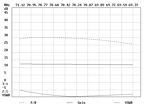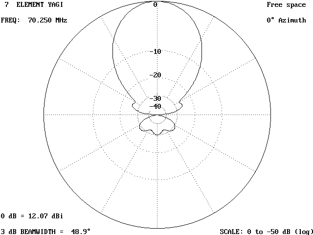 The 4m or 70Mhz band is not an allocation that is in widespread use, consequently the bulk of the equipment for this band has to be homemade. In the UK the band extends from 70.00 to 70.50, this 7 element beam, designed around a centre frequency of 70.25 provides approximately 12dBi gain with a F/B ratio of 30dB.