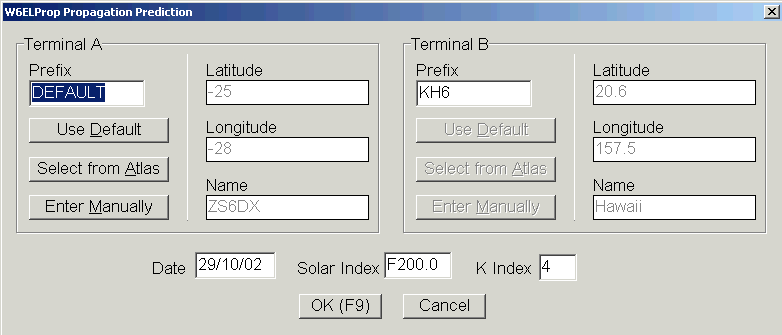 To make a prediction using W6ELProp you need to input some information into the program. The first thing the program needs to know is where you are, here you can enter your prefix (ZS) and the program will pick up from the database your co-ordinates, once this is set-up you can enter any valid pre-fix to make a prediction. The program will also ask for the solar flux number or solar spot count along with the current value of the A index. These figures can be found on the Internet or you can listen to WWV on 15Mhz.