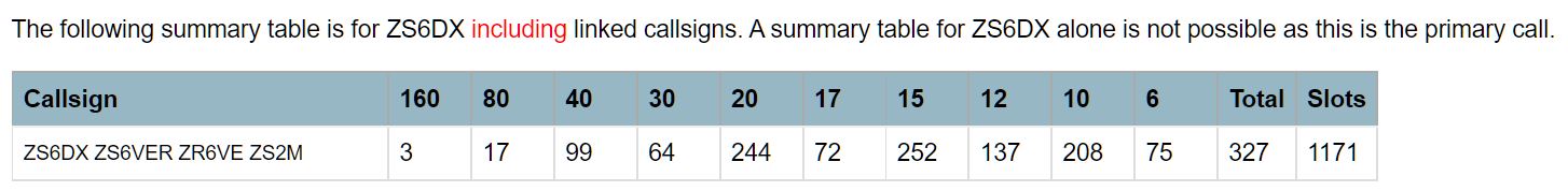 These totals were extracted from my logbook (LOGGER) and includes a summary of all my contacts except for contacts made while on DX'peditions using calls other than my own ZS calls (ZR6VE, ZS6VER and currently ZS6DX). This does NOT include contacts made with my V51VE call.