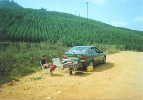 Stationary mobile somewhere in Swaziland (3DA) operating as 3DA/ZS6VER. Mast with dipoles in background, running 100w from the cars battery and an Icom IC-706 MK II. The co-operator here is my YL, Katti - ZS6KVR/V51KV.